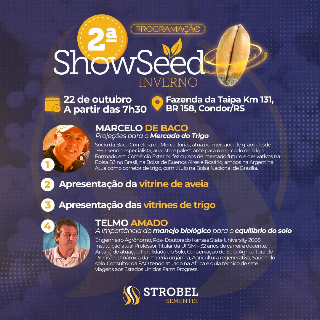 A Strobel Sementes vai realizar a 2º edição do ShowSeed de Inverno, no dia 22 de outubro, a partir das 07h30, na Fazenda da Taipa, KM 131, BR 158, Condor/RS.