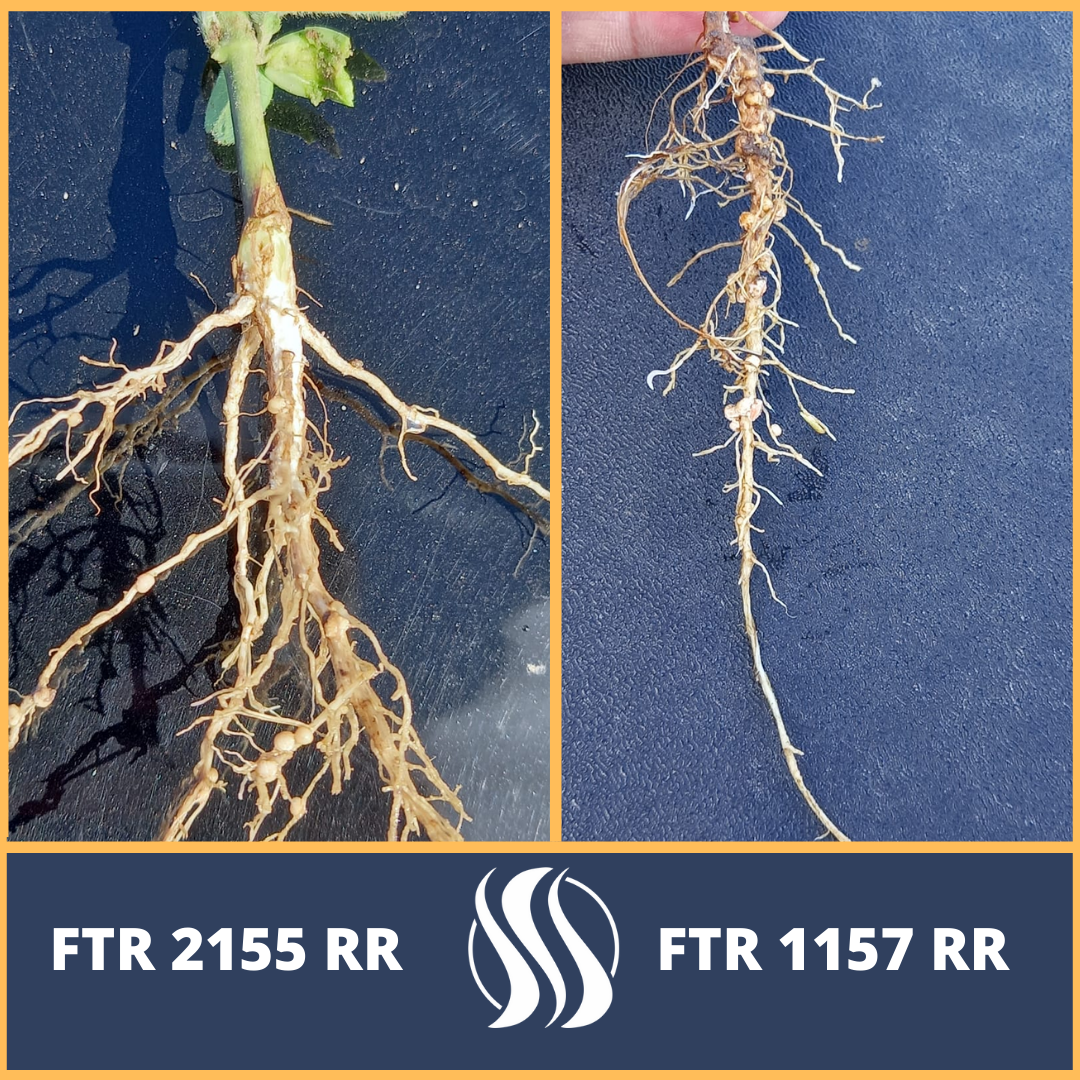 Nessa figura, também é apresentada a FTR 1157 RR, uma cultivar com sistema radicular pivotante, que atinge maiores profundidades de solo.