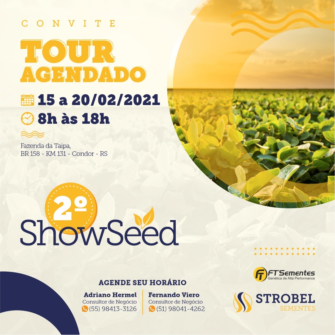 A Strobel Sementes, diante do cenário imposto pela Covid-19, adaptou e inovou a forma de realização do ShowSeed. O evento que demonstra no campo o desenvolvimento das cultivares, será realizado durante seis dias, de 15 a 20 de fevereiro,  na  Área Experimental da sementeira, localizada na Fazenda da Taipa, BR 158, KM 131, Condor – RS,  das 8h às 18h. Os participantes inscritos serão divididos em grupos de no máximo 10 a 15 pessoas, para que não haja aglomeração.
